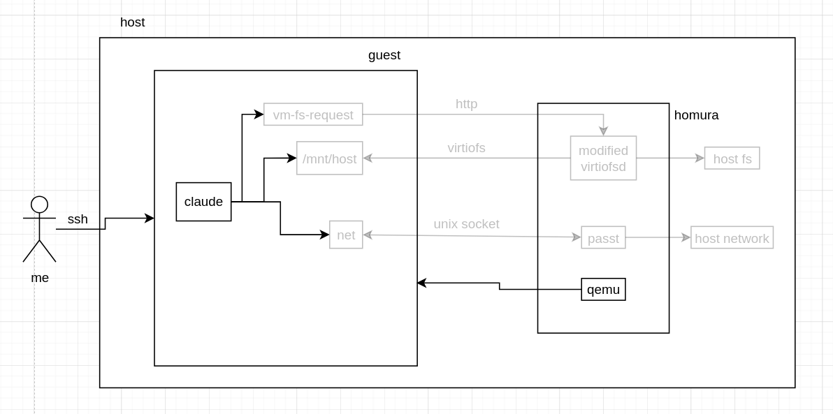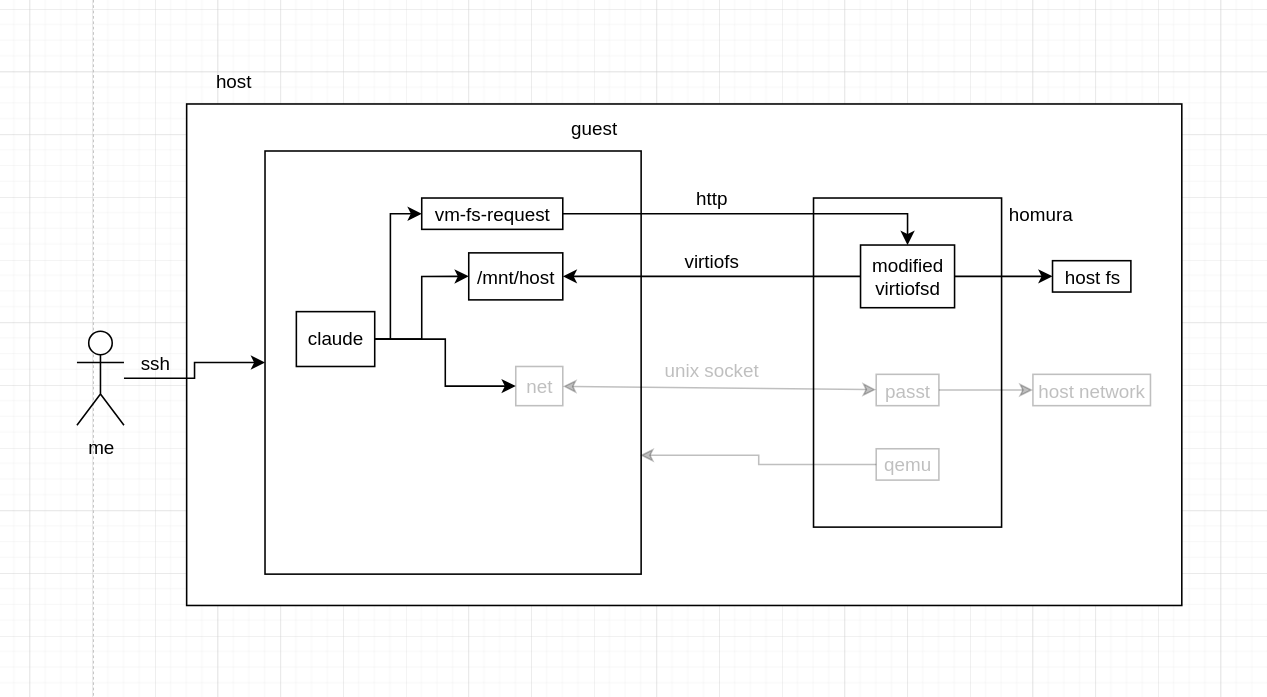 after all this, this is the current architecture for how the filesystem works. important CC paths like ~/.claude get linked from /mnt/host/home/<user>/.claude into the VM's /root/.claude (the modified virtiofsd ensures that the files made by the VM which are by root are ultimately owned by my non-root user in the host).