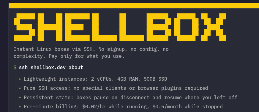 compared to sprites and exe.dev, shellbox's UI runs purely inside SSH, your account is your SSH public key
