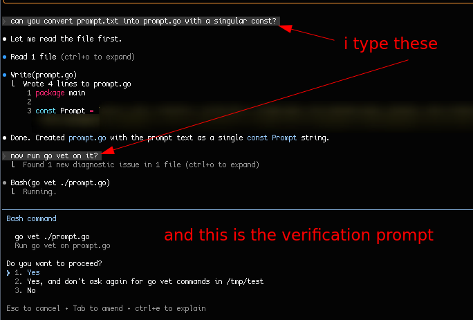 - selecting "yes, and don't ask again for (command)" relies on CC's detection of which part of the command is common, and which part varies between invocations